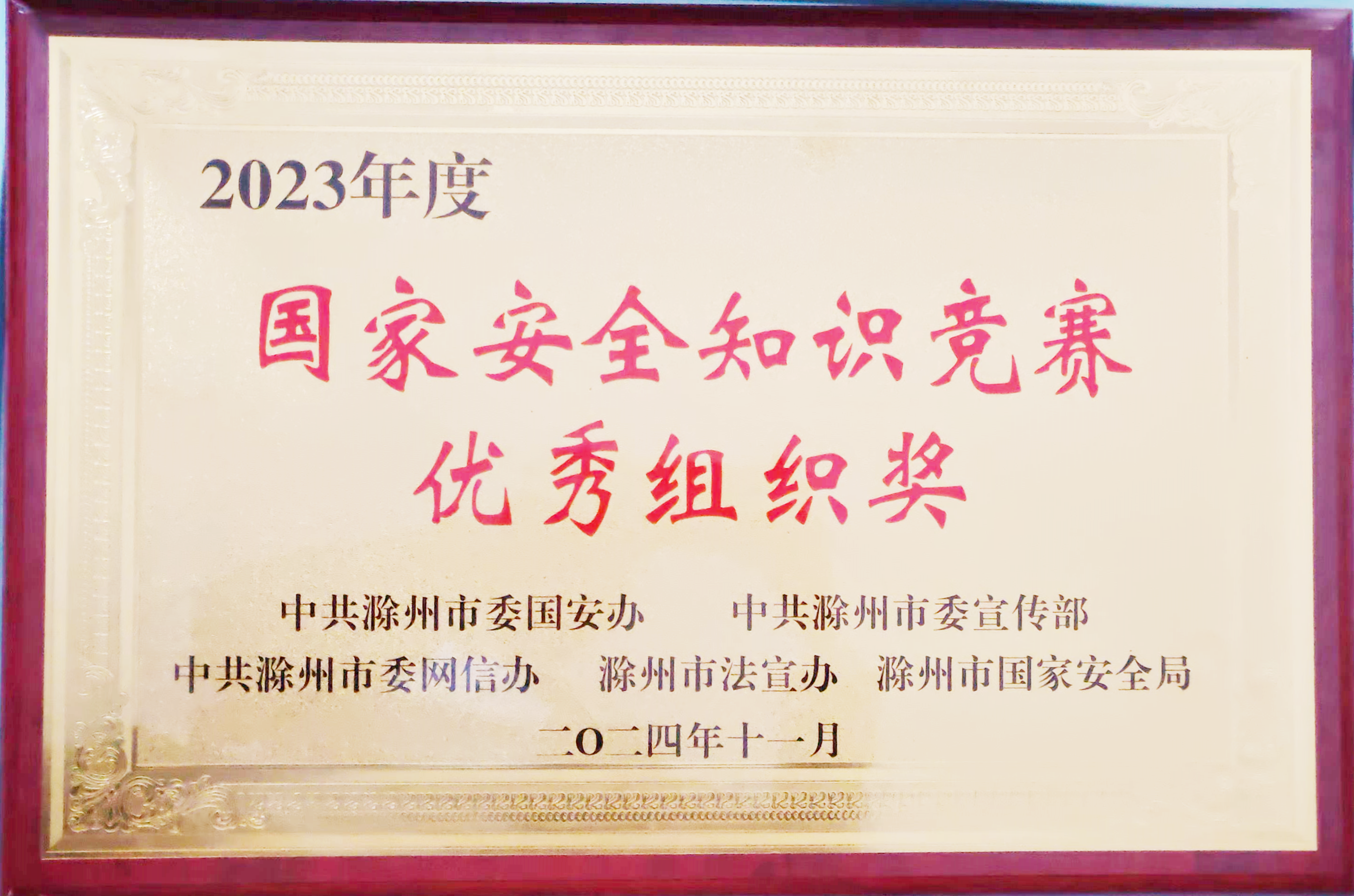 近日,市擔(dān)保集團榮獲滁州市2023年度“國家安全知識競賽優(yōu)秀組織獎”,該競賽由市委國安辦、市委宣傳部、市委網(wǎng)信辦、市法宣辦、市國家安全局聯(lián)合組織開展,集團已連續(xù)兩年獲此榮譽。