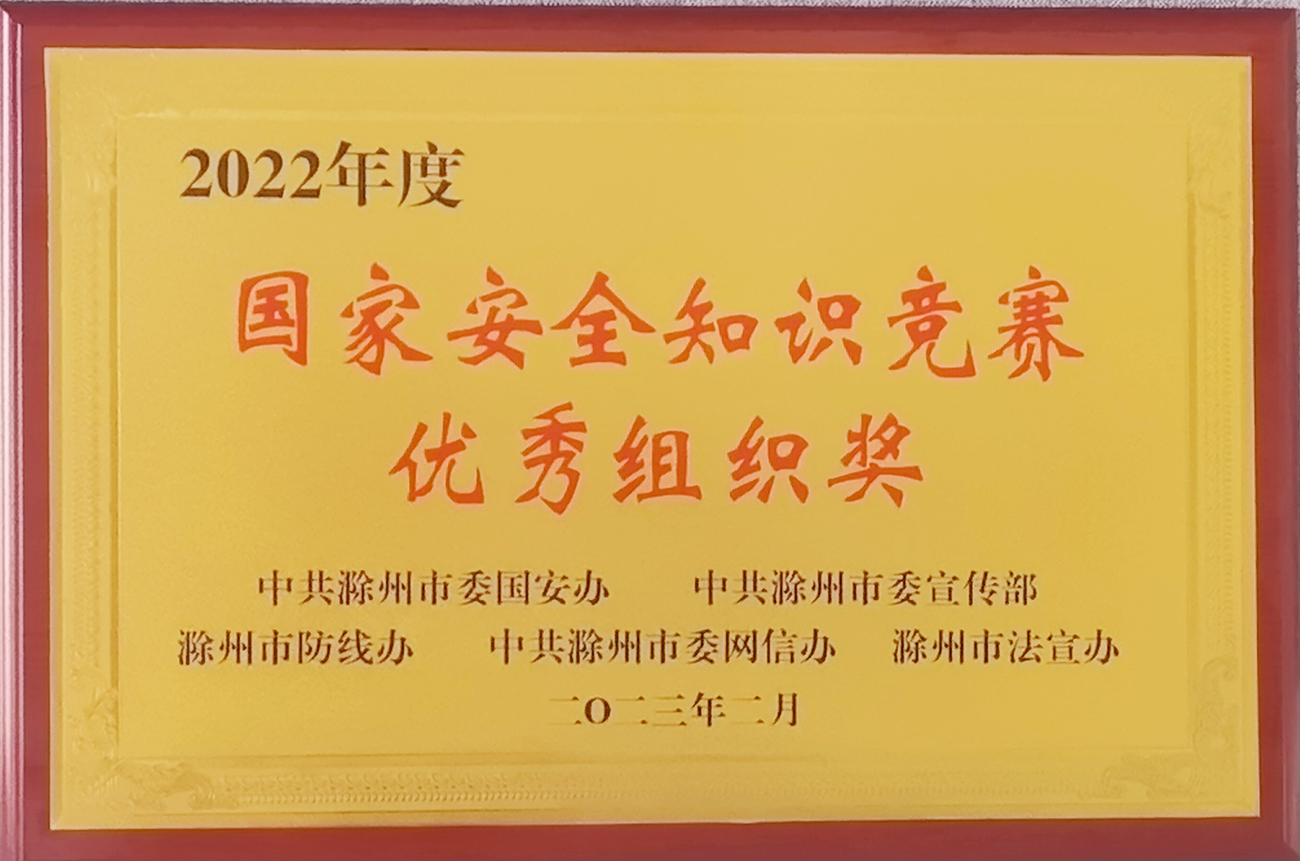 近日,市擔(dān)保集團榮獲滁州市第四屆國家安全有獎知識競賽優(yōu)秀組織獎,該競賽由市委國安辦、市委宣傳部、市防線辦、市委網(wǎng)信辦、市法宣辦等五部門聯(lián)合舉辦,全市僅12家單位獲此榮譽。